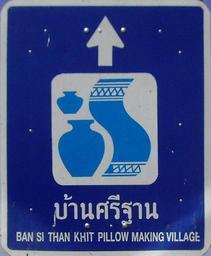 Keywords: Handicraft village.jpg en Handicraft village direction sign for Ban Si Than Khit Pillow Making Village Tambon Si Than Amphoe Pa Tio Yasothon Province Thailand th บ้านศรีฐน ต ศรีฐาน อ ป่าติ้ว จ ยโสธร Own work photgraphed in Yasothon Province TH Pawyilee 2008-10-15 Own file; all rights released Cropped perspective corrected from larger version Location 15° 47' 3 8473 N 104° 19' 56 15766 W Road signs in Thailand Blue signs |