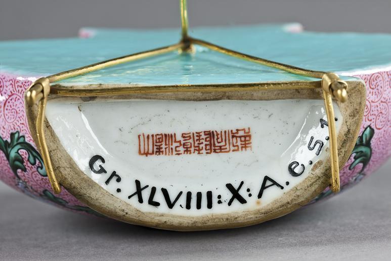 Keywords: Hängvas undersidan, 1700-tal - Hallwylska museet - 99432.tif LSH artwork sv HÄNGVAS ett par Framsidan bukig baksidan plan på densamma en krokholk Runt halsen i relief ett dubbelt band framtill med knut halsen och skuldran veckiga På buken i mitten en rund medaljong med skrivtecknet för ordet shou långt liv ; på ömse sidor en drake omgiven av blom- och bladrankor På foten en snirkelbård nedanför mynningen en meanderbård På mynningskanten samt på fotens ytterkant en guldrand Baksidan vasen inuti delvis samt krokholken inuti är turkosfärgade <br/>Pair of porcelain wall vases decorated in overglaze enamels<br/>Mark and period of Qianlong 1736-95 <br/>The vases are in the shape of bags with cords round their necks The backs of the vases are flat with a hole for suspension when used in a room or travelling in a sedan chair The inside neck and back are enamelled turquoise The front has a background pattern of dense dark pink scrolls on a lighter pink ground with a pair of five-clawed dragons confronting a central medallion containing the character for long life Behind and beneath the dragons is a stylised lotus scroll its central flower with upward-pointing stamen Although not of the very first quality the enamelling is done with care and precision The style and content of decoration indicate porcelain produced during the early Qianlong reign in the 1740s The very finest wares of this type in the imperial collections in Taipei and Beijing have underglaze blue marks while these vases have a reign mark in overglaze red enamel original caption Hängvas undersidan 1700-tal <br/> Nyckelord Kinesiska tecken Föremålsbild Qianlong Qingdynastin - 1735 1795 size cm 6 9 mynning size cm 4 5 size cm 3 6 mynning size cm 3 5 fot size cm 13 size cm 12 4 size cm 7 8 fot HWY place of origin CN original filename hm_dig13737 14642 inventory number HWY XLVIII X A e s 01 99432 CC-BY-SA Jens Mohr <gallery caption Different images of same object > File Kinesisk signatur och museets föremålsnummer över - Hallwylska museet - 95864 tif File Hängvaser bakifrån tillverkad i Kina 1735-1795 - Hallwylska museet - 99429 tif File Hängvas undersidan - Hallwylska museet - 99431 tif File Kinesiska porslinshängvaser i rosa från 735-1795 med kinesiska tecknet shou långt liv - Hallwylska museet - 95863 tif File Hängvaser från Kina 1735-1795 - Hallwylska museet - 100472 tif File Baksida hängvaser från Kina 1735-1795 - Hallwylska museet - 100473 tif </gallery> Qianlong Emperor Qing Dynasty Relics Chinese characters Chinese ceramics in the Hallwyl Museum Sweden Ceramics of Korea Ceramics of Japan Urns Ceramics Jens Mohr Media contributed by LSH dim-with multiple size templates Media contributed by LSH 2015-11