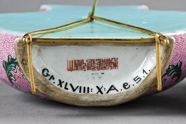 Keywords: Hängvas undersidan - Hallwylska museet - 99431.tif LSH artwork sv HÄNGVAS ett par Framsidan bukig baksidan plan på densamma en krokholk Runt halsen i relief ett dubbelt band framtill med knut halsen och skuldran veckiga På buken i mitten en rund medaljong med skrivtecknet för ordet shou långt liv ; på ömse sidor en drake omgiven av blom- och bladrankor På foten en snirkelbård nedanför mynningen en meanderbård På mynningskanten samt på fotens ytterkant en guldrand Baksidan vasen inuti delvis samt krokholken inuti är turkosfärgade <br/>Pair of porcelain wall vases decorated in overglaze enamels<br/>Mark and period of Qianlong 1736-95 <br/>The vases are in the shape of bags with cords round their necks The backs of the vases are flat with a hole for suspension when used in a room or travelling in a sedan chair The inside neck and back are enamelled turquoise The front has a background pattern of dense dark pink scrolls on a lighter pink ground with a pair of five-clawed dragons confronting a central medallion containing the character for long life Behind and beneath the dragons is a stylised lotus scroll its central flower with upward-pointing stamen Although not of the very first quality the enamelling is done with care and precision The style and content of decoration indicate porcelain produced during the early Qianlong reign in the 1740s The very finest wares of this type in the imperial collections in Taipei and Beijing have underglaze blue marks while these vases have a reign mark in overglaze red enamel original caption Hängvas undersidan <br/> Nyckelord Kinesiska tecken - 1735 1795 size cm 6 9 mynning size cm 4 5 size cm 3 6 mynning size cm 3 5 fot size cm 13 size cm 12 4 size cm 7 8 fot HWY place of origin CN original filename hm_dig13736 14642 inventory number HWY XLVIII X A e s 01 99431 CC-BY-SA Jens Mohr <gallery caption Different images of same object > File Kinesisk signatur och museets föremålsnummer över - Hallwylska museet - 95864 tif File Hängvaser bakifrån tillverkad i Kina 1735-1795 - Hallwylska museet - 99429 tif File Kinesiska porslinshängvaser i rosa från 735-1795 med kinesiska tecknet shou långt liv - Hallwylska museet - 95863 tif File Hängvas undersidan 1700-tal - Hallwylska museet - 99432 tif File Hängvaser från Kina 1735-1795 - Hallwylska museet - 100472 tif File Baksida hängvaser från Kina 1735-1795 - Hallwylska museet - 100473 tif </gallery> Chinese characters Chinese ceramics in the Hallwyl Museum Sweden Ceramics of Korea Ceramics of Japan Urns Ceramics Jens Mohr Media contributed by LSH dim-with multiple size templates Media contributed by LSH 2015-11