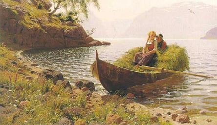 Keywords: Hans Dahl - In calm waters (In stiller Bucht).jpg Artwork Creator Hans Dahl oil on canvas cm 85 1 144 2 Private collection accession number object history credit line http //www artnet com/artist/4740/hans-dahl html http //s3 uploads ru/ApOPH jpg PD-old-auto-1923 1937 Paintings by Hans Dahl Genre paintings from Norway Paintings of Norwegian fjords Reapers in art Paintings of norwegian peasants National costumes of Norway in art Paintings in private collections Hay in art Rowboats in art Oil on canvas Paintings of couples sitting in boats |