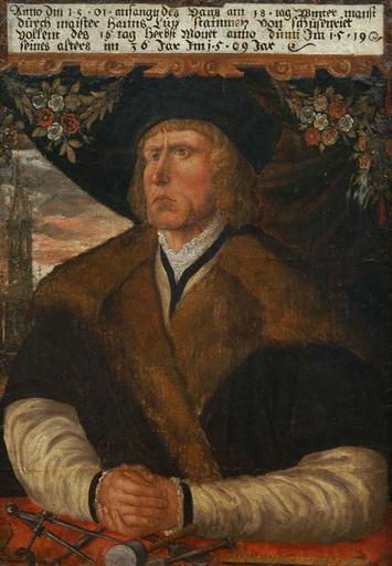 Keywords: Hans Lutz 1509.jpg Hans Lutz Steinmetz aus Schussenried um 1473 in Schussenried 1525; kam 1499 als Parlier nach Bozen 1509 Oil on canvas Stadtmuseum Bozen cm 74 8 52 9 Anno die 1501 anfangen des Hans am 18 tag winter manst/ durch maister Hanns Lutz Stainmetz von Schussenriet/ vollent des 16 tag herbst Mon domini 1519/ seines alters im 36 Jar Im 1509 Jar caption upper center http //tirolerportraits it/ other versions PD-old-100 Stadtmuseum Bozen 1500s paintings in Italy 1509 portrait paintings Male 16th-century oil portraits of men at half length 1509 16th-century portrait paintings in Italy 1509 People of Bad Schussenried Flower garlands Fur garments in art Males with black headwear in art Masons in art Paintings with German inscriptions Paintings with years of production artist Paintings in the province of South Tyrol People of South Tyrol Portrait paintings with tools 1509 |