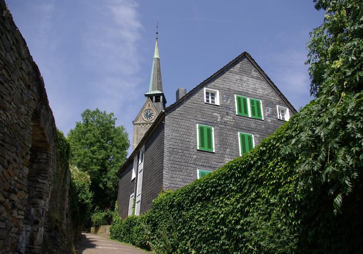 Keywords: Harkorthaus Wetter 001.JPG Harkorthaus in Wetter Ruhr dahinter die Reformierte Kirche own Janericloebe 2010-07 Harkorthaus Slate gables in North Rhine-Westphalia