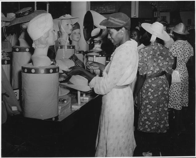 Keywords: Harmony Community, Putnam County, Georgia. Saturday is the shopping day of the week, of course, and . . . - NARA - 521254.tif Scope and content Full caption reads as follows Harmony Community Putnam County Georgia Saturday is the shopping day of the week of course and all the stores are full of buyers and lookers This African-American woman is getting a new summer hat General notes 521254 Local identifier 83-G-37942 Department of Agriculture Bureau of Agricultural Economics Division of Economic Information ca 1922 - ca 1953 NARA-Author Rusinow Irving Photographer 5307166 <br /> Still Picture Records Section Special Media Archives Services Division NWCS-S National Archives at College Park 8601 Adelphi Road College Park MD 20740-6001 1941 05 28 - 1941 06 01 Record group Record Group 83 Records of the Bureau of Agricultural Economics 1876 - 1959 Record group ARC 412 Photographic Prints Documenting Programs and Activities of the Bureau of Agricultural Economics and Predecessor Agencies compiled ca 1922 - ca 1947 documenting the period ca 1911 - ca 1947 Series ARC 521048 File unit File unit ARC Variant control numbers NAIL Control Number NWDNS-83-G-37942 yes Other versions <gallery> File Harmony_Community _Putnam_County _Georgia _Saturday_is_the_shopping_day_of_the_week _of_course _and_ _ _ _-_NARA_-_521254 tif tif File Harmony_Community _Putnam_County _Georgia _Saturday_is_the_shopping_day_of_the_week _of_course _and_ _ _ _-_NARA_-_521254 jpg jpg </gallery> NARA-cooperation PD-USGov Shopping Black and white photographs of females with hats African American women Hats of the United States Irving Rusinow NARA TIF images with categorized JPGs |