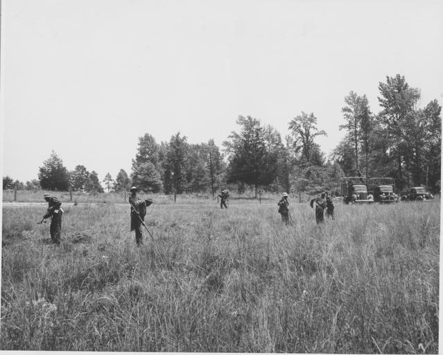 | Keywords: Harmony Community, Putnam County, Georgia.... These are (African-American) CCC boys working in a fie . . . - NARA - 521319.jpg Scope and content Full caption reads as follows Harmony Community Putnam County Georgia These are African-American CCC boys working in a field south of Harmony Their job here is to clear five acres of weeds and brambles Ordinarily scrub and waste are not burned since the burning tends to harm the soil In this instance some of the briar patches were too dense to be dealt with in any other way Work of this sort is done on the land of any man white or African-American if he will adopt certain conservation practices and is known to be a cooperator A local priority board decides who is eligible for this service No more than five acres are cleared on any one farm but pasture is fenced free of charge if the operator will supply the materials Most people disapprove of the conservation program because they think the government shouldn't tell people how to farm General notes 521319 Local identifier 83-G-41006 Department of Agriculture Bureau of Agricultural Economics Division of Economic Information ca 1922 - ca 1953 NARA-Author Rusinow Irving Photographer 5307166 <br /> Still Picture Records Section Special Media Archives Services Division NWCS-S National Archives at College Park 8601 Adelphi Road College Park MD 20740-6001 1941 05 28 - 1941 06 01 Record group Record Group 83 Records of the Bureau of Agricultural Economics 1876 - 1959 Record group ARC 412 Photographic Prints Documenting Programs and Activities of the Bureau of Agricultural Economics and Predecessor Agencies compiled ca 1922 - ca 1947 documenting the period ca 1911 - ca 1947 Series ARC 521048 File unit File unit ARC Variant control numbers NAIL Control Number NWDNS-83-G-41006 Other versions <gallery> File Harmony_Community _Putnam_County _Georgia _These_are_ African-American _CCC_boys_working_in_a_fie_ _ _ _-_NARA_-_521319 tif tif File Harmony_Community _Putnam_County _Georgia _These_are_ African-American _CCC_boys_working_in_a_fie_ _ _ _-_NARA_-_521319 jpg jpg </gallery> NARA-cooperation PD-USGov Irving Rusinow Putnam County Georgia Black and white photographs of Georgia U S state |