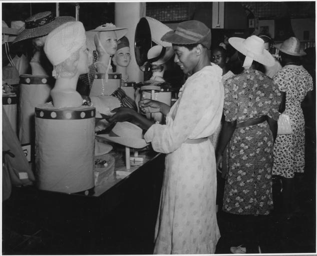 Keywords: Harmony Community, Putnam County, Georgia. Saturday is the shopping day of the week, of course, and . . . - NARA - 521254.jpg Scope and content Full caption reads as follows Harmony Community Putnam County Georgia Saturday is the shopping day of the week of course and all the stores are full of buyers and lookers This African-American woman is getting a new summer hat General notes 521254 Local identifier 83-G-37942 Department of Agriculture Bureau of Agricultural Economics Division of Economic Information ca 1922 - ca 1953 NARA-Author Rusinow Irving Photographer 5307166 <br /> Still Picture Records Section Special Media Archives Services Division NWCS-S National Archives at College Park 8601 Adelphi Road College Park MD 20740-6001 1941 05 28 - 1941 06 01 Record group Record Group 83 Records of the Bureau of Agricultural Economics 1876 - 1959 Record group ARC 412 Photographic Prints Documenting Programs and Activities of the Bureau of Agricultural Economics and Predecessor Agencies compiled ca 1922 - ca 1947 documenting the period ca 1911 - ca 1947 Series ARC 521048 File unit File unit ARC Variant control numbers NAIL Control Number NWDNS-83-G-37942 Other versions <gallery> File Harmony_Community _Putnam_County _Georgia _Saturday_is_the_shopping_day_of_the_week _of_course _and_ _ _ _-_NARA_-_521254 tif tif File Harmony_Community _Putnam_County _Georgia _Saturday_is_the_shopping_day_of_the_week _of_course _and_ _ _ _-_NARA_-_521254 jpg jpg </gallery> NARA-cooperation PD-USGov Shopping Black and white photographs of females with hats African American women Hats of the United States Irving Rusinow |