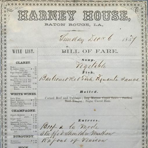 Keywords: Harney House restaurant menu (December 6, 1857).jpg en Harney House Baton Rouge 1857 Bill of Fare Menus from hotels restaurants and steamboats in the 1850s and 60s The name WM J RHODUS Proprietor is prominently displayed at the bottom of this menu http //digital lib uh edu/u /p15195coll34 148 Hospitality Industry Archives 1857-12-06 This image is in the public domain and may be used freely If publishing in print electronically or on a website please use the citation Courtesy of Special Collections University of Houston Libraries To order a higher resolution reproduction see http //info lib uh edu/about/campus-libraries-collections/special-collections-archives/request-digital University of Houston Libraries Food menus Hotels in Baton Rouge Restaurants in Baton Rouge 1857 in Louisiana Baton Rouge in the 1850s FAL |