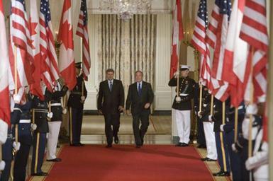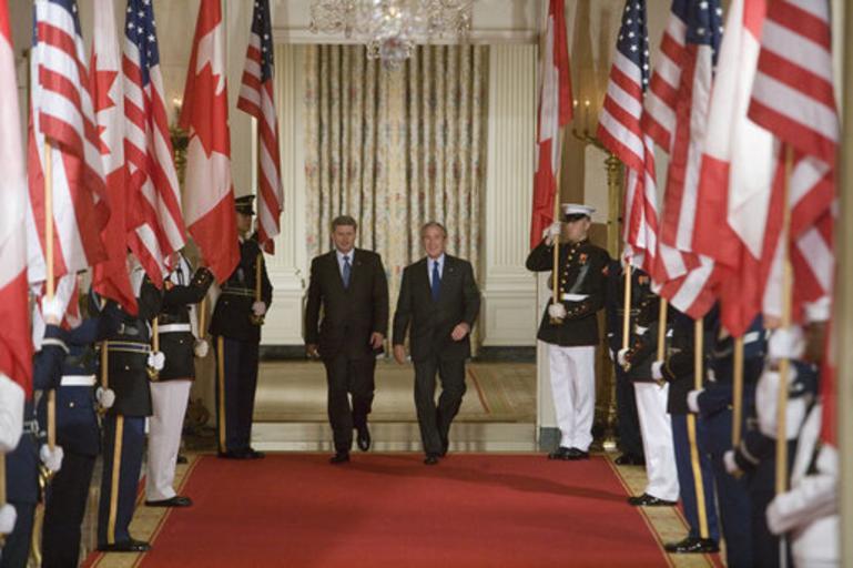 Keywords: Harper and Bush.jpg President George W Bush and Prime Minister Stephen Harper of Canada hold a joint press conference in the East Room Thursday July 6 2006 I'm impressed by his leadership style said President Bush I appreciate the fact that he doesn't mince words he tells me what's on his mind and he does so in a real clear fashion White House photo by Kimberlee Hewitt PD-USGov George W Bush in 2006 20060706 Stephen Harper in 2006 Stephen Harper with national leaders |