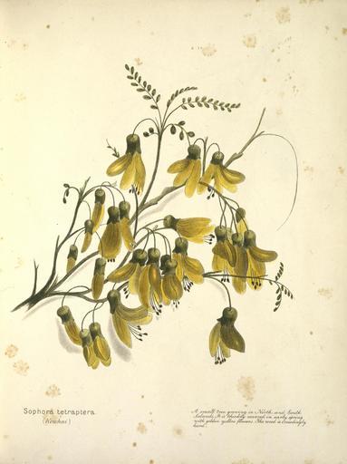 | Keywords: artist:name=emily cumming harris artist:name=emilycummingharris taxonomy:binomial=sophora tetraptera taxonomy:binomial=sophoratetraptera taxonomy:common=kowhai artist:viaf=9793637 drawing A branch showing leaves and flowers of kowhai Quantity: 1 colour art print(s). Physical Description: Lithograph, hand-coloured, 305 x 245 mm Harris, Emily Cumming, 1836?-1925. Harris, Emily Cumming, 1837?-1925 :Sophora tetraptera (kowhai). A small tree growing in North and South Islands. It is thickly covered in early spring with golden yellow flowers. The wood is exceedingly hard. [1899?]. Ref: PUBL-0024-1-05. Alexander Turnbull Library, Wellington, New Zealand. natlib.govt.nz/records/22876706 A branch showing leaves and flowers of kowhai Quantity: 1 colour art print(s). Physical Description: Lithograph, hand-coloured, 305 x 245 mm Harris, Emily Cumming, 1836?-1925. Harris, Emily Cumming, 1837?-1925 :Sophora tetraptera (kowhai). A small tree growing in North and South Islands. It is thickly covered in early spring with golden yellow flowers. The wood is exceedingly hard. [1899?]. Ref: PUBL-0024-1-05. Alexander Turnbull Library, Wellington, New Zealand. natlib.govt.nz/records/22876706 |