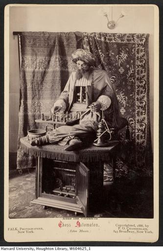 Keywords: Harvard Theatre Collection - Ajeeb the Wonderful TCS 1.183.jpg en Cabinet card image of chess automaton Ajeeb the Wonderful 1886 http //via lib harvard edu 80/via/deliver/deepLinkItem recordId olvwork604625 componentId FHCL Hough 5022980 TCS 1 183 Harvard Theatre Collection Harvard University This is a media file that Houghton Library believes to be in the public domain of the United States This applies to a work published before January 1 1923 or the unpublished work of an author who died more than 70 years ago Houghton Library and Harvard University claim no rights in this photographic reproduction of the work and the image is free to download and reproduce for any use commercial or non-commercial without any further permission required We request that where these media files are used the Houghton Library is credited as the source of the materials Please include this citation TCS 1 183 Harvard Theatre Collection Harvard University as its source In the event that any of the media files infringes your rights or the rights of any third parties or file is not properly identified or acknowledged we would like to hear from you so we may make any necessary alterations In this event please contact Houghton_Library harvard edu Institution Houghton Library 1886 http //via lib harvard edu 80/via/deliver/deepLinkItem recordId olvwork604625 componentId FHCL Hough 5022980 TCS 1 183 Harvard Theatre Collection Harvard University Falk New York photographer PD-old thumb left Cropped version Chess automata Harvard Theatre Collection 1886 photographs |