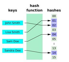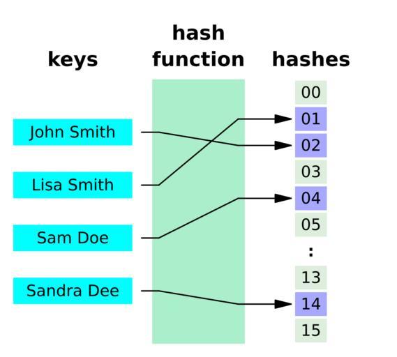 Keywords: Hash table 4 1 1 0 0 0 0 LL.svg en Hash function illustration with four names being mapped to the integers 0 15 without collisions Created with User Jorge Stolfi/make-hash-table-figure v 2009-04-12 with parameters -nkeys 4 -back 0 -funcbox 1 -sparse 1 -keys 0 -values 0 -collisions 0 -links 0 -overflow LL Own Jorge Stolfi 2009-04-12 Hash tables |