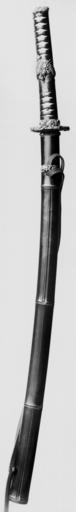| Keywords: Hashimoto Ichizo - Long Sword with Imitation Bamboo Saya and Dragon - Walters 511218 - Group.jpg This piece has a brown lacquer saya in imitation of bamboo and mountings decorated with gold dragons on a silver nanako ground of fine technique The piece has a silver dragon menuki a gold habaki and a double seppa of gold and silver A two-handed tsuka has a same ray skin and ito-maki broken between 1817 1882 late Edo-Meiji lacquer silver gilded copper gold wood steel mounted katana cm 91 l accession number 51 1218 5433 Henry Walters Baltimore date and mode of acquisition unknown Walters Art Museum Henry Walters Acquired by Henry Walters kazusa no kami fujiwara munemichi; Translation Munemichi of the Fujiwara clan Lord of Kazusa place of origin Edo present-day Tokyo Japan Walters Art Museum license Japanese swords and koshirae in the Walters Art Museum Koshirae katana Hashimoto Ichizo Media contributed by the Walters Art Museum needs artist review Fujiwara no Munemichi Swordsmiths |