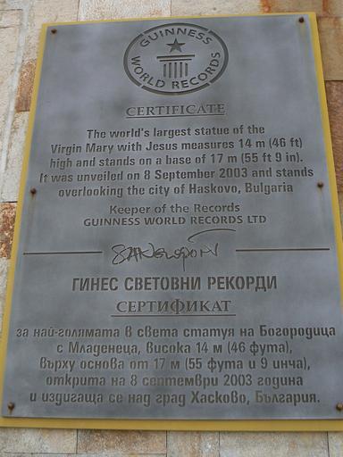 | Keywords: Haskovo-bogorodica-guinness-certificate.JPG Се тификатът на Гинес за монумента Света Бого одица Хасково The Guinness certificate for the Monument of Virgin Mary Haskovo Own 2007-08-19 Vassia Atanassova - Spiritia Haskovo monument of Virgin Mary Plaques in Bulgaria Guinness World Records |