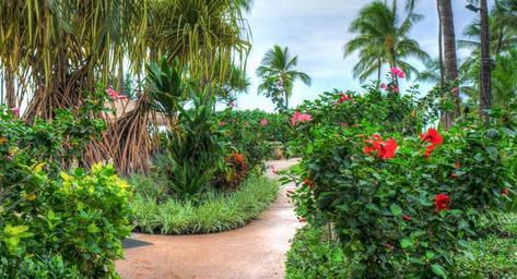 Keywords: hawaii oahu ko olina marriott resort tropical flowers outdoor travel vacation summer ocean sky holiday tourism colorful garden path walkway