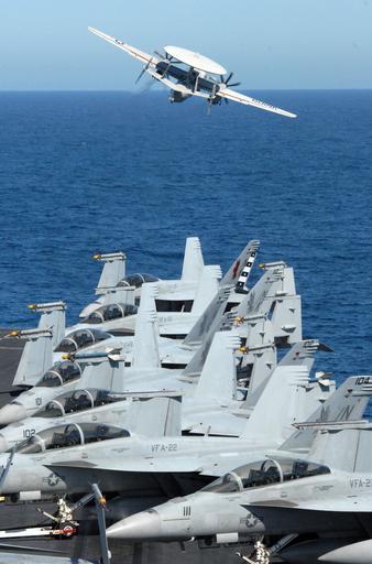 Keywords: Hawkeye launches off USS Ronald Reagan DVIDS159960.jpg en An E-2C Hawkeye assigned to the Black Eagles of Airborne Early Warning Squadron 113 departs from the flight deck of the Nimitz-class aircraft carrier USS Ronald Reagan Missions for the Hawkeye include offensive and defensive counter air control air interdiction and surface surveillance coordination Ronald Reagan and Carrier Air Wing 14 are underway conducting a sustainment exercise in the Pacific Ocean 2009-03-24 Rosalie Garcia https //www dvidshub net/image/159960 090324-N-+++++-090 2009-03-26 05 02 USPACOM AT SEA PD-USGov-Military-Navy Northrop Grumman E-2C Hawkeye aircraft carrier take-offs Military aircraft in flight near USS Ronald Reagan CVN-76 Images from DoD uploaded by Fæ |
