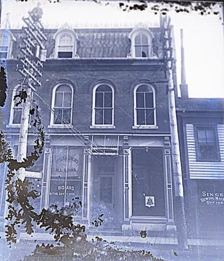 Keywords: hotels businesses 1890s restaurants outdoor Exterior view of a hotel/restaurant offering "Meals & Lunches at All Hours". The building to the right housed a Singer sewing machine office. One of a set of glass negatives associated with Herbert 'Burt' Rathbun (1861-1897). The negative is slightly damaged. Exterior view of a hotel/restaurant offering "Meals & Lunches at All Hours". The building to the right housed a Singer sewing machine office. One of a set of glass negatives associated with Herbert 'Burt' Rathbun (1861-1897). The negative is slightly damaged. |