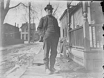 Keywords: men clothes 1890s houses monochrome blackandwhite black and white An older man standing on a boardwalk next to a muddy street with houses behind him and to his right. One of a set of glass negatives associated with Herbert 'Burt' Rathbun (1861-1897). An older man standing on a boardwalk next to a muddy street with houses behind him and to his right. One of a set of glass negatives associated with Herbert 'Burt' Rathbun (1861-1897). |