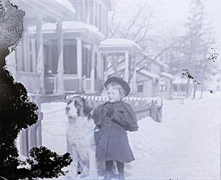Keywords: 1890s children dogs winter clothes snow Small child standing next to a St. Bernard dog. One of a set of glass negatives associated with Herbert 'Burt' Rathbun (1861-1897). The negative is slightly damaged. Small child standing next to a St. Bernard dog. One of a set of glass negatives associated with Herbert 'Burt' Rathbun (1861-1897). The negative is slightly damaged. |