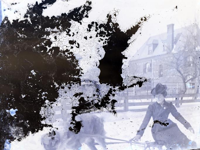 Keywords: 1890s women dogs sleds winter houses snow outdoor Woman [perhaps Agnes Rathbun, née Bell] on a sled being pulled by a St. Bernard dog. There is a three-story building in the background. One of a set of glass negatives associated with Herbert 'Burt' Rathbun (1861-1897). The negative is badly damaged on the left side. Woman [perhaps Agnes Rathbun, née Bell] on a sled being pulled by a St. Bernard dog. There is a three-story building in the background. One of a set of glass negatives associated with Herbert 'Burt' Rathbun (1861-1897). The negative is badly damaged on the left side. |