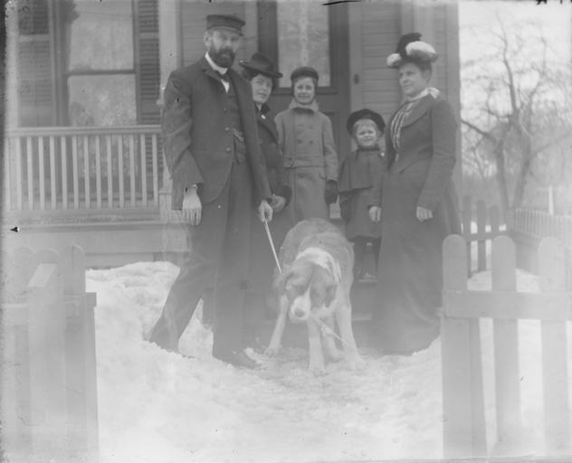 Keywords: men women children dogs winter clothes 1890s houses monochrome blackandwhite black and white A man, two women, two children and a dog standing on the front steps of a house in the snow. One of a set of glass negatives associated with Herbert 'Burt' Rathbun (1861-1897). The man could be Burt, and one of the women his wife Agnes (formerly Bell). A man, two women, two children and a dog standing on the front steps of a house in the snow. One of a set of glass negatives associated with Herbert 'Burt' Rathbun (1861-1897). The man could be Burt, and one of the women his wife Agnes (formerly Bell). |
