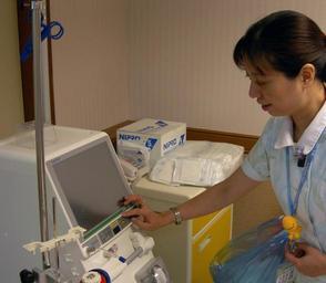 Keywords: HCCH hemodialysis machine.jpg en HCCH's HDR Head RN operating a new hemodialysis machine own Jackhsiao 2006-07-28 Hsiao Chung Cheng Hospital Hemodialysis