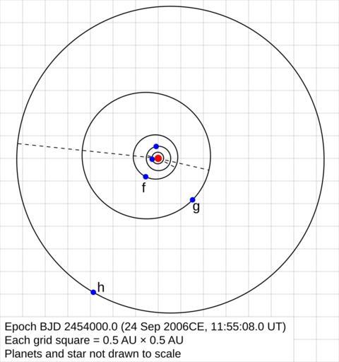 | Keywords: HD10180OuterOrbits.svg en Plot of the orbits of the outer planets in the HD 10180 system Orbit data taken from Lovis et al 2010 The HARPS search for southern extra-solar planets XXVII Up to seven planets orbiting HD 10180 probing the architecture of low-mass planetary systems available at http //www eso org/public/archives/releases/sciencepapers/eso1035/eso1035 pdf This image only includes the orbits of the outermost five planets d e f g h and of these only f g and h are labelled The innermost orbit corresponds to planet d the next one out is that of planet e The configuration is given in Table 6 and the orbits are taken to be coplanar with the planets revolving anticlockwise about the central star Orbits are depicted as being astrocentric as the true masses are unknown making the computation of the position of the barycentres impossible own Icalanise 2010-08-25 <gallery> File HD10180Orbits svg Combined with the inner orbits </gallery> HD 10180 Exoplanet diagrams Hydrus |