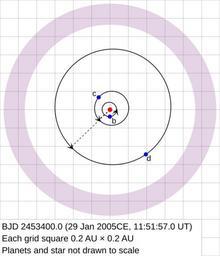 Keywords: HD69830orbits.svg en Plot of the orbits of the HD 69830 system Orbit data taken from Wright et al 2009 The Astrophysical Journal 693 2 1084 “1099 http //adsabs harvard edu/abs/2009ApJ 693 1084W Ten New and Updated Multiplanet Systems and a Survey of Exoplanetary Systems The configuration is given in Table 1 and the orbits are taken to be coplanar Planetary positions are given for the epoch BJD 2453400 0 which lies within the quoted times of periastron passage for the three planets The orbits are taken to be astrocentric rather than barycentric This is because the true masses of the planets are unknown so it is not possible to compute the actual positions of the barycentres Debris disc parameters taken from Lisse et al 2008 The Astrophysical Journal 658 1 584 “592 http //adsabs harvard edu/abs/2007ApJ 658 584L On the Nature of the Dust in the Debris Disk around HD 69830 In section 4 1 of the paper the dust disc is stated to be located at a distance of 0 93 “1 16 AU from the star which are used as the inner and outer boundaries of the annulus representing the disc Further details about how the orbital parameters are converted to SVG are available in the source code for the file own Icalanise HD 69830 Exoplanet diagrams Debris disks |