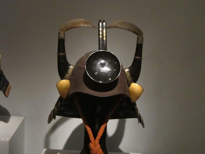 | Keywords: Head-shaped helmet with a sake cup, a pair of chopsticks, and pair of sickles, 17th century.JPG en Head-shaped helmet with a sake cup a pair of chopsticks and a pair of sickles Edo period 17th century iron wood lacquer silk and gold own Haa900 photo 2013 Zunari kabuto Wakidate Cc-zero |