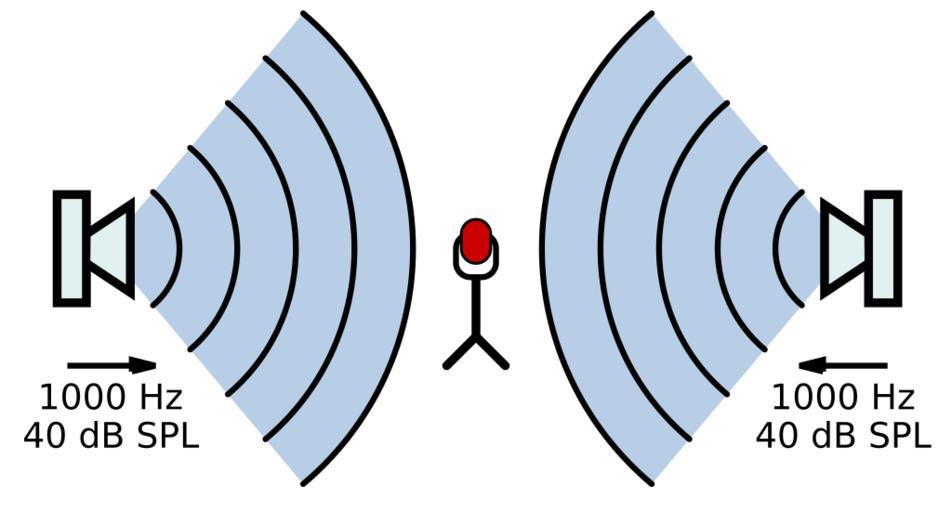 | Keywords: Hearing Science brainteaser - constructive interference.svg en In a silent room there are two stereo speakers facing one another equidistant from a microphone If each speaker is outputting a pure tone at 1000Hz with 40dB SPL amplitude and their periods are such that there is perfect constructive interference at the microphone what frequency and amplitude will the microphone record own Inductiveload 2009-02-15 Otology Interference Sensory Neuroscience Hearing and speech | ||||