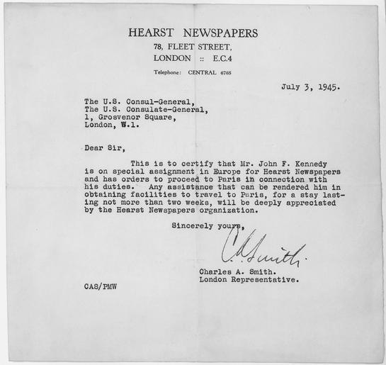 | Keywords: Hearst Newspapers Letter on JFK Credentials - NARA - 192714.tif Scope and content Letter certifying that John F Kennedy is on special assignment for the Hearst Newspapers in London General notes 192714 Local identifier Kennedy John F John Fitzgerald 1917-1963 John F Kennedy Library NLJFK Columbia Point Boston MA 02125-3398 1945-07-03 Record group Collection JFK-1 John F Kennedy Personal Papers 1917 - 1963 Record group ARC 595678 Boston Office Files compiled 1940 - 1956 Series ARC 192712 File unit John F Kennedy Personal Papers Boston Office 1940 - 1956 Personal Correspondence Hearst Newspapers International News Service 04/25/1945 - 07/28/1945 File unit ARC 192713 Variant control numbers NAIL Control Number NLK-JFKPP-BSTNOFFPERSO-HEARSTNWSPAPERS-LTRREJFKCREDENT yes Other versions NARA-cooperation PD-USGov Documents related to John F Kennedy |