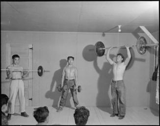Keywords: Heart Mountain Relocation Center, Heart Mountain, Wyoming. The instructor and two students demonstr . . . - NARA - 538756.jpg Scope and content The full caption for this photograph reads Heart Mountain Relocation Center Heart Mountain Wyoming The instructor and two students demonstrate the proper handling of weights in the weight lifting class at this center General notes 538756 Local identifier 210-G-E93 Department of the Interior War Relocation Authority 02/16/1944 - 06/30/1946 NARA-Author Parker Tom Photographer 4682167 <br /> Still Picture Records Section Special Media Archives Services Division NWCS-S National Archives at College Park 8601 Adelphi Road College Park MD 20740-6001 1942-09-16 Record group Record Group 210 Records of the War Relocation Authority 1941 - 1989 Record group ARC 537 Central Photographic File of the War Relocation Authority compiled 1942 - 1945 Series ARC 536000 File unit File unit ARC Variant control numbers NAIL Control Number NWDNS-210-G-E93 Other versions <gallery> File Heart_Mountain_Relocation_Center _Heart_Mountain _Wyoming _The_instructor_and_two_students_demonstr_ _ _ _-_NARA_-_538756 tif tif File Heart_Mountain_Relocation_Center _Heart_Mountain _Wyoming _The_instructor_and_two_students_demonstr_ _ _ _-_NARA_-_538756 jpg jpg </gallery> NARA-cooperation PD-USGov Heart Mountain War Relocation Center Barbells Men with dumbbells |