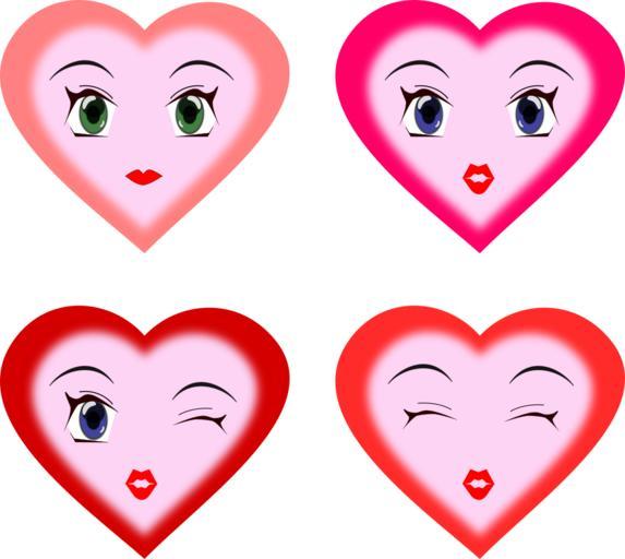 Keywords: hearts faces expressions emotions love symbols signs pink red lighter darker shades colorful colors four sets collection group smileys shapes romance romantic lovers couples valentines happy surprised curious eyes closed one eye closed opened eyes looking |