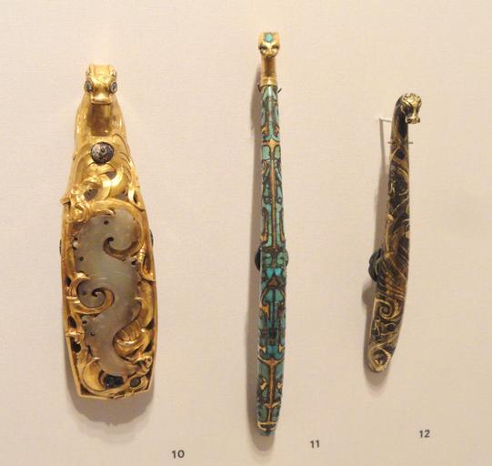 Keywords: Heavy Gold Buckle and Two Gilt Bronze Belt Hooks, 475-221 BC, Warring States Period, China, with inlays - Sackler Museum - DSC02589.JPG Exhibit in the Sackler Museum Harvard University Cambridge Massachusetts USA The museum permitted photography of this artwork without restriction This artwork is in the public domain because the artist died more than 70 years ago Daderot 2012-11-17 12 40 49 Daderot cc0 cc0 Chinese metalwork in the Sackler Museum Metalwork of the Warring States period Bronzes of the Warring States |