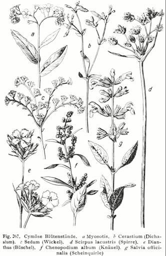 Keywords: Hegi cymose inforescences.png Abbildung 267 aus Hegi G Illustrierte Flora von Mittel-Europa S CXXXIX Bildunterschrift Fig 267 Cymöse Blütenstände a Myosotis b Cerastium Dichasium c Sedum Wickel d Scirpus lacustris Spirre e Dianthus Büschel f Chenopodium album Knäuel g Salvia officinalis Scheinquirle Figure 267 from Hegi G Illustrierte Flora von Mittel-Europa p 139 Caption Fig 267 Cymose inflorescences a Myosotis b Cerastium dichasium c Sedum scorpioid cyme d Scirpus lacustris anthela e Dianthus fasciculus f Chenopodium album glomerulus g Salvia officinalis verticillastrum Hegi Gustav 1906 Illustrierte Flora von Mittel-Europa mit besonderer Berücksichtigung von Deutschland Oesterreich und der Schweiz zum Gebrauche in den Schulen und zum Selbstunterricht Band I Pteridophyta Gymnospermae und Monocotyledones Künstlerische Leitung Gustav Dunzinger Verlag J F Lehmann München 1906 Gustav Hegi 1876 “1932 Gustav Dunzinger PD-old Hegi Illustrierte Flora von Mittel-Europa Salvia officinalis - botanical illustrations Cymes |