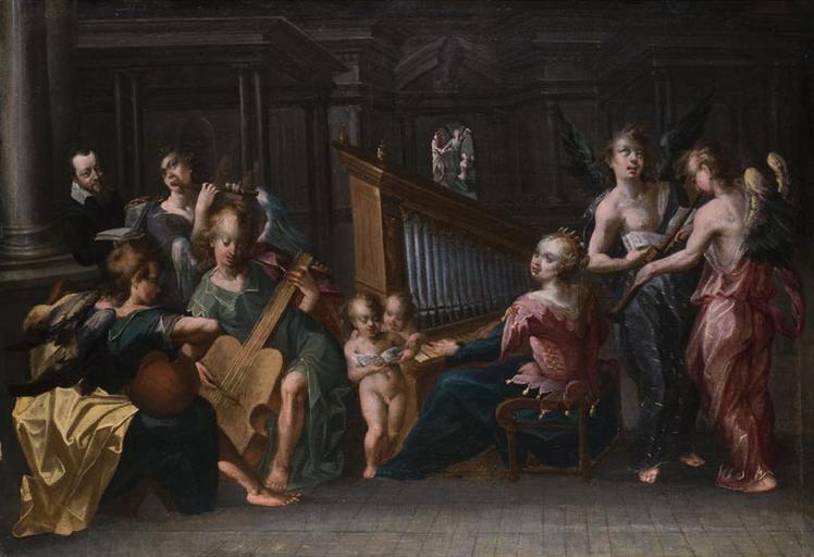 Keywords: Heilige Cäcilia mit Engeln Prag 17 Jh.jpg Artwork anonymous painter<br> Langswitch Prager Maler des 17 Jahrhunderts Prague painter of the 17 century century 17 Oil canvas cm 54 78 object history credit line accession number hampel-auctions com PD-old-100 Saint Cecilia as organist Music-making angels Hans von Aachen Follower Images from Hampel Auctions |