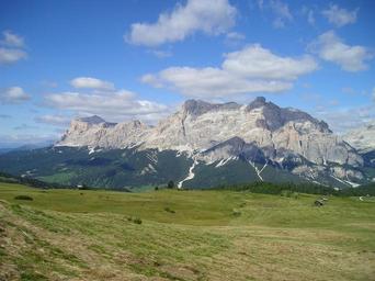 Keywords: heiligkreuzkofel kreuzkofelgruppe dolomites meadow grass panorama mountains alpine south tyrol italy