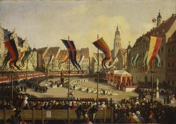 Keywords: Heinrich Schneider - Die Enthüllung der Prinzgemahlstatue auf dem Marktplatz in Coburg.jpg Heinrich Justus Schneider 1811-1884 In the marketplace at Coburg ringed by wooden stands a procession of young girls lay wreaths at the foot of the newly-unveiled statue of Prince Albert to left of which is a semi-circle of singers and brass bands; right white royal pavilion 1866 Oil on canvas cm 82 8 117 2 Institution Royal Collection Windsor object history credit line Purchased by Queen Victoria 20 June 1866 WRA PP2/107 10773 ; WRA PP Accounts paid 9 July 1866 60/16/10 accession number 406971 http //www royalcollection org uk/collection/406971/the-unveiling-of-the-prince-consorts-statue-in-the-marketplace-at Royal Collection PD-old-100 Heinrich Justus Schneider Art in the Royal Collection of the United Kingdom in Windsor Castle Statue of Albert Prince Consort Coburg |