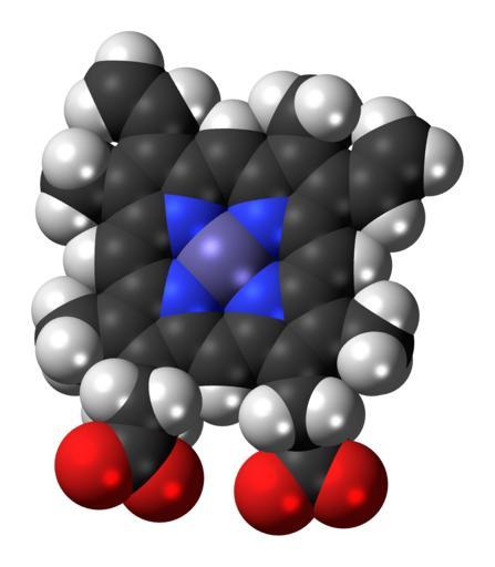 Keywords: Heme B anion 3D spacefill.png Space-filling model of the Heme B complex also known as haem B the core of hemoglobin that carries oxygen in blood This image shows the anionic form with a negative charge of 2 Colour code 505050  Carbon  C  black<br> F0F0F0  Hydrogen  H  white<br> F51E1E  Oxygen  O  red<br> 3C50FA  Nitrogen  N  blue<br> 8078C0  Iron  Fe  grey-purple<br> 2011-06-27 own DS Visualizer Jynto talk Neutral form ball-and-stick version Neutral form space-filling version Anionic form ball-and-stick version cc-zero Images by Jynto Space-filling models Haem b