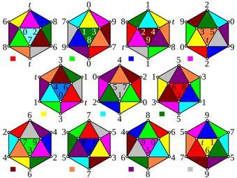 Keywords: Hemi-icosahedron coloured.svg The eleven hemi-icosahedra The small rectangles to the bottom-right of each represents the colour of that 11-cell; each face is coloured with the colour of the 11-cell with which it is shared Image Hemi-icosahedron svg 2007-04-01 Real work by en User Tomruen SVG by User Stannered PD original Non-coloured version References Diagram generated from one found in H S M Coxeter A Symmetrical Arrangement of Eleven Hemi-Icosahedra Annals of Discrete Mathematics 20 1984 pp 103-114 Created with Inkscape Tilings-db-temp Hemi-icosahedron 11-cell en English Wikipedia Tomruen