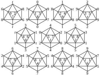 Keywords: Hemi-icosahedron.svg The eleven hemi-icosahedra Own 2007-04-01 User Stannered Release to PD Coloured version Created with Inkscape Tilings-db-temp Hemi-icosahedron References Diagram generated from one found in H S M Coxeter A Symmetrical Arrangement of Eleven Hemi-Icosahedra Annals of Discrete Mathematics 20 1984 pp 103-114 |