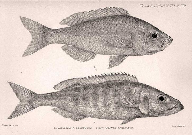 Keywords: Hemibates stenosoma & Bathybates fasciatus.jpg s/george-albert-boulenger-ichtyologiste htm George Albert Boulenger date PD-old Lake Tanganyika cichlids Bathybates fasciatus Hemibates