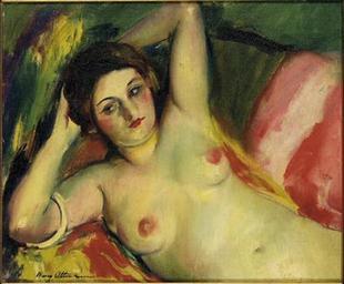 | Keywords: Henry Ottmann - Nu au bracelet.jpg Artwork creator Henry Ottmann century 20 Oil canvas cm 45 7 54 6 Private collection accession number object history credit line http //www christies com/lotfinderimages/d48500/d4850063r jpg Christie's Henry Ottmann Paintings of nude recumbent females supine Females with bracelets in art PD-old Topless females with both hands behind head |