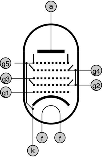 | Keywords: Heptode-Symbol de.svg Symbol fuer eine Heptode a - Anode k - Kathode f - Heizung g1 - Steuergitter g2 - Schirmgitter g3 - Steuergitter g4 - Schirmgitter g5 - Bremsgitter gezeichnet mit Inkscape 2007-03-23 erstellt von de User Fgli SVG vacuum tubes |