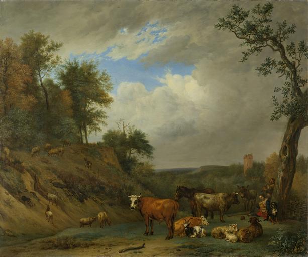 Keywords: Herders met hun vee Rijksmuseum SK-A-318.jpeg nl Herders met hun vee Onder een oude boom geeft een vrouw haar kind de borst achter haar een herder met een doedelzak Bij de boom zit een hond Voor hun en links op de helling van een heuvel grazen en rusten koeien schapen geiten een ezel en een paard drager Height cm 81 drager Width cm 97 5 exhibition history 2007-2007 Rembrandt and the Golden Age of Dutch Art Treasures from the Rijksmuseum - III - B Portland Oregon 2007-2007 Rembrandt and the Golden Age of Dutch Art Treasures from the Rijksmuseum - II - B Phoenix Arizona 2006-2007 Rembrandt and the Golden Age of Dutch Art Treasures from the Rijksmuseum - I - B Dayton Ohio Institution Rijksmuseum Technique oil canvas object history Acquisition 1808 object type PD-US PD-old-100 Data and photography rights All data and all images made available through the API are either in the public domain or are subject to a CC0 license https //www rijksmuseum nl/en/api/terms-and-conditions-of-use cc-zero place of creation http //www rijksmuseum nl/collectie/SK-A-318 Herders met hun vee Q17320077 Uploaded with GWToolset Herders met hun vee Rijksmuseum SK-A-318 http //www rijksmuseum nl/media/assets/SK-A-318 Images uploaded by Fæ Images from the Rijksmuseum Paintings by Paulus Potter in the Rijksmuseum Amsterdam Paintings after Paulus Potter |