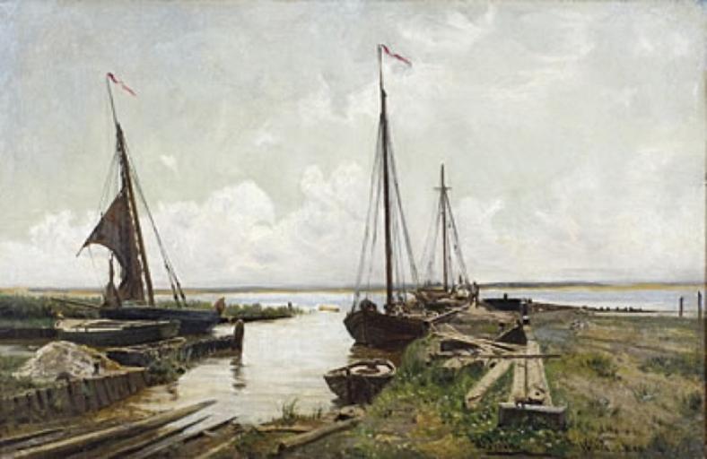 Keywords: Hermann Eschke - Boddenhafen Wieck.jpg Artwork Creator Hermann Eschke 1884-07-09 oil canvas cm 34 0 51 0 object history credit line u r signiert datiert und bezeichnet 'Wieck 9 07 84' accession number http //www theartkey com/index php page news_id id 193 rlang de theartkey com PD-old-100 Hermann Eschke Mecklenburg-Vorpommern in art Wieck a Darß Saaler Bodden 1884 paintings |