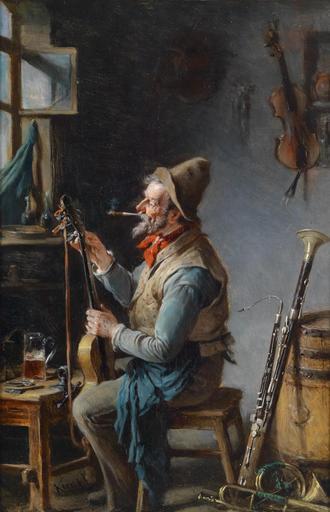 Keywords: Hermann Kern Ganz bei der Sache.jpg Ganz bei der Sache eigenhändiges Klebeetikett title Kern H signature oil on wood 48 x 31 5 cm http //www dorotheum com Dorotheum by 1912 Creator Hermann Kern PD-old-70-1923 Images from Dorotheum Hermann Kern Luthiers in art Luthier's workshops |