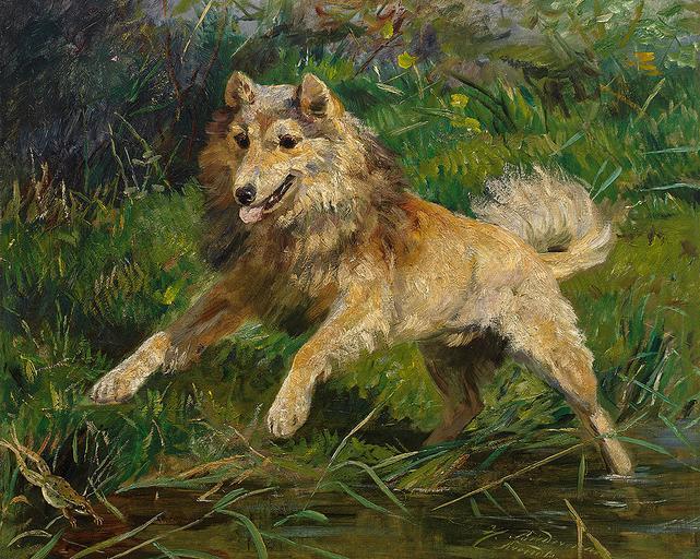 | Keywords: Hermine Biedermann-Arendts Collie verfolgt Frosch.jpg Collie verfolgt einen Frosch Collie takes on a Frog ca 1870 1916 Oil on canvas cm 55 66 5 Michael Zeller's auction house Lindau Germany http //www zeller de/de/suchergebnisse-alle-kataloge/auktionsartikel/hermine-biedermann-arendts-1855-muenchen-1916-garmisch-partenkirchen-begann-1870-auf-anregung-vo/ Call number 1175 PD-Art Other versions Rough Collies in art Paintings of dogs Hermine Biedermann-Arendts Images from Auktionshaus Zeller |