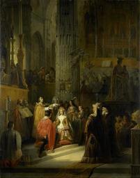 Keywords: Het huwelijk van Jacoba van Beieren, gravin van Holland, en Jan IV, hertog van Brabant, op 10 maart 1418 Rijksmuseum SK-A-1030.jpeg nl Het huwelijk van Jacoba van Beieren gravin van Holland en Jan IV hertog van Brabant gesloten op 10 maart 1418 in de hofkapel te 's-Gravenhage Kerkinterieur waarin het paar geknield bij het altaar wordt gezegend door de priester De verzamelde aanwezigen kijken toe links stroomt het licht door het kerkvenster naar binnen Height cm 166 Width cm 132 exhibition history 2005-2006 Meesters van de Romantiek Nederlandse kunstenaars 1800-1850 Rotterdam Institution Rijksmuseum Technique oil canvas object history Acquisition 1839 object type Potential derivatives exist check http //commons wikimedia org/w/index php search Rijksmuseum+SK-A-1030 this search PD-US PD-old Data and photography rights All data and all images made available through the API are either in the public domain or are subject to a CC0 license https //www rijksmuseum nl/en/api/terms-and-conditions-of-use cc-zero place of creation http //www rijksmuseum nl/collectie/SK-A-1030 Het huwelijk van Jacoba van Beieren gravin van Holland en Jan IV hertog van Brabant op 10 maart 1418 Q17323700 Uploaded with GWToolset Het huwelijk van Jacoba van Beieren gravin van Holland en Jan IV hertog van Brabant op 10 maart 1418 Rijksmuseum SK-A-1030 http //www rijksmuseum nl/media/assets/SK-A-1030 Images uploaded by Fæ Images from the Rijksmuseum Paintings in the Rijksmuseum Amsterdam |