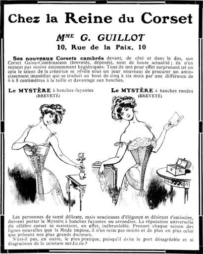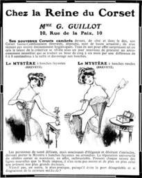 Keywords: Hez laReine duCorsetMneGGuillotFemina1906.png Hez la Reine du Corset Mne G Guillot Femina; page XIII 1906; 15 Octobre; PD Chez la Reine du Corset MME G GUILLOT 10 Rue de la Paix 10 Ses nouveaux Corsets cambres devant de cote et dans le dos son Corset Gaine-Combinaison brevetés déposés sont de haute actualité; ils n'en restent pas moins éminemment hygiéniques Tous ils ont pour effet surprenant et en cela le talent de la créatrice se révèle sous un jour nouveau de procurer un amincissement immédiat qui se traduit au bout de cinq a six mois par une différence de 6 a 8 centimètres a la taille et davantage aux hanches Le MYSTÈRE a hanches fuyantes BREVETÉ Le MYSTÈRE a hanches rondes BREVETÉ Les personnes de santé délicate mais soucieuses d'élégance et désirant s'amincire doivent porter le Mystère a hanches fuyantes ou arrondies La réputation universelle du célèbre corset se maintient en effet inébranlable Prenant chaque saison des lignes nouvelles que la Mode impose il n'en reste pas moins et de plus en plus celui que prônent nos plus grands docteurs N'est-il pas en outre le plus pratique puisqu'il evite le port désagréable et si disgracieux de la ceinture médicale PD-old Corset advertisements 1906 advertisements in France Fashion in 1906 Femina French magazine |
