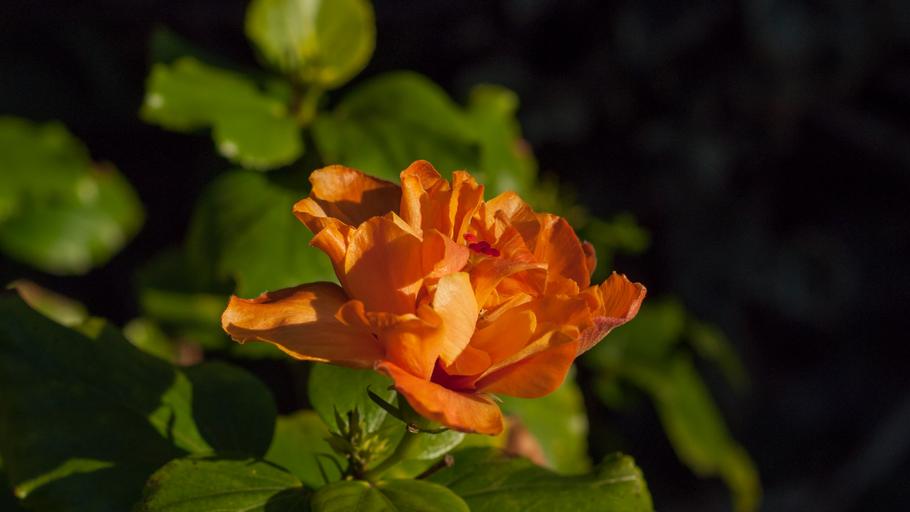 | Keywords: hibiscus flowers orange petals blossoms floral multilayered multiple layers tropical flowering plants blooms blooming decorative ornamental gardens gardening green leaves leafy bright colorful sunny day sunlight illuminated nature branches stems shrubs exotic hawaiian |