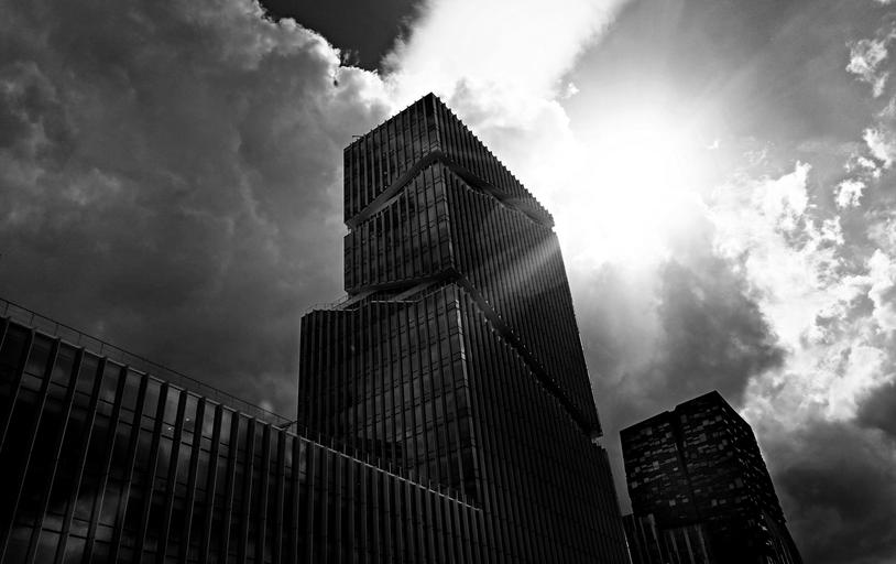 Keywords: high rise skyscraper tower silhouette clouds dramatic gothic sunlight sunray backlighting office glass finance financial district commercial economy bw photo monochrome black-and-white
